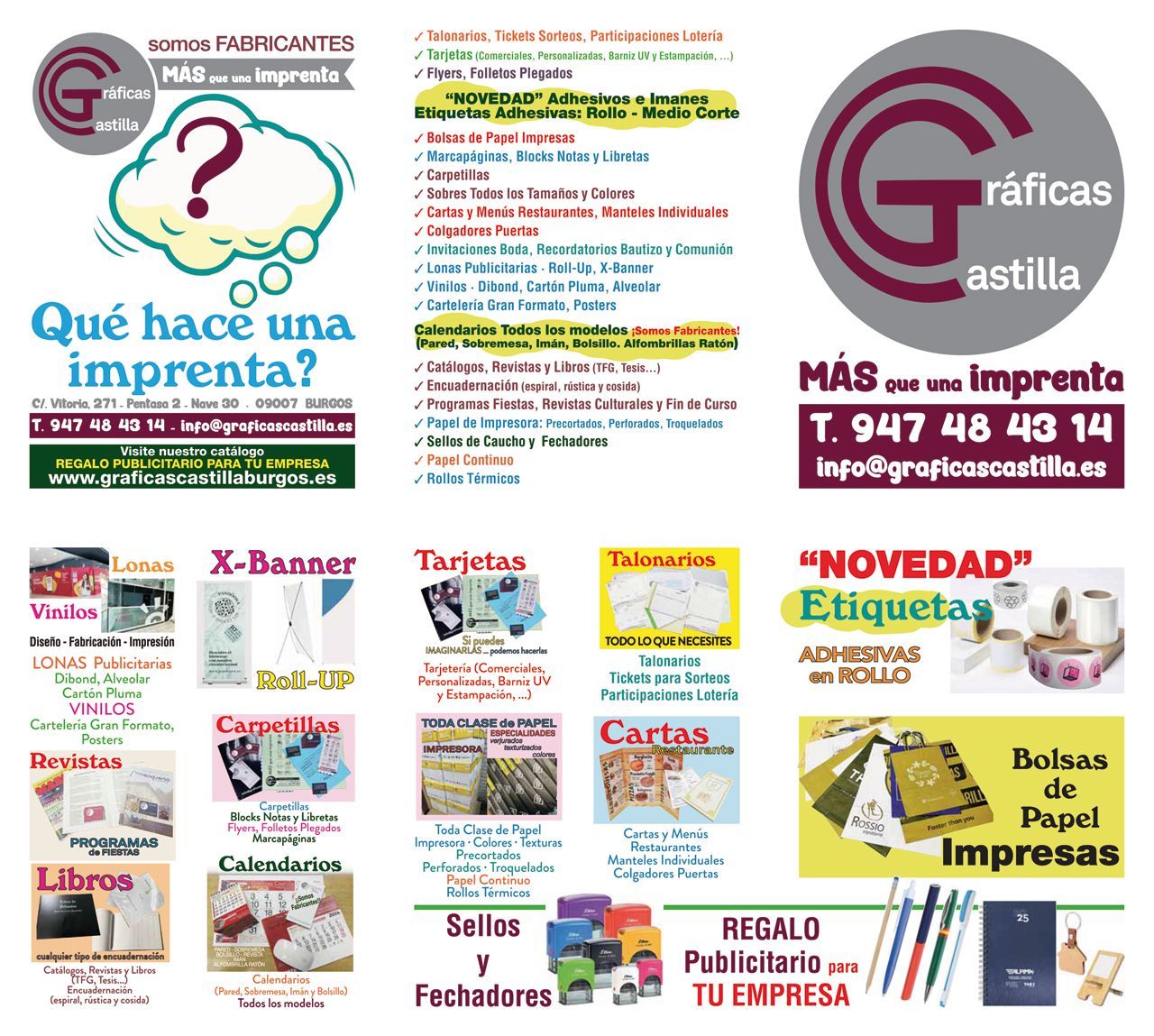 GRAFICAS CASTILLA es una empresa del sector de las Artes Gráficas comprometida con el Medio Ambiente. Realizamos todo tipo de servicios en imprenta y artes gráficas: creatividad y diseño, pre-impresión y CTP, impresión de folletos, libros, tesis, revistas, catálogos, tarjetas, sobres de cualquier tamaño, adhesivos en vinilo, talonarios, programas y carteles de fiestas, invitaciones de boda e imagénes corporativas, encuadernaciones y todo tipo de manipulados. Fabricamos calendarios a su medida. Todo con la mayor calidad y el mejor servicio. Enviamos a cualquier punto de la geografía española.